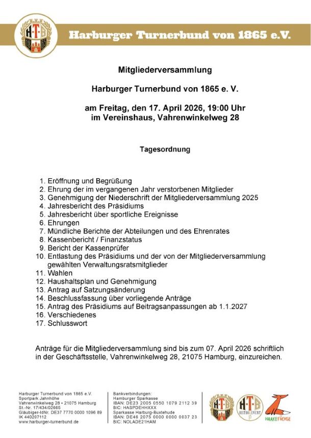 Die Versammlung findet am Freitag den 17.04.2026 um 19 Uhr im Vereinshaus, im Vahrenwinkelweg 28 statt.
